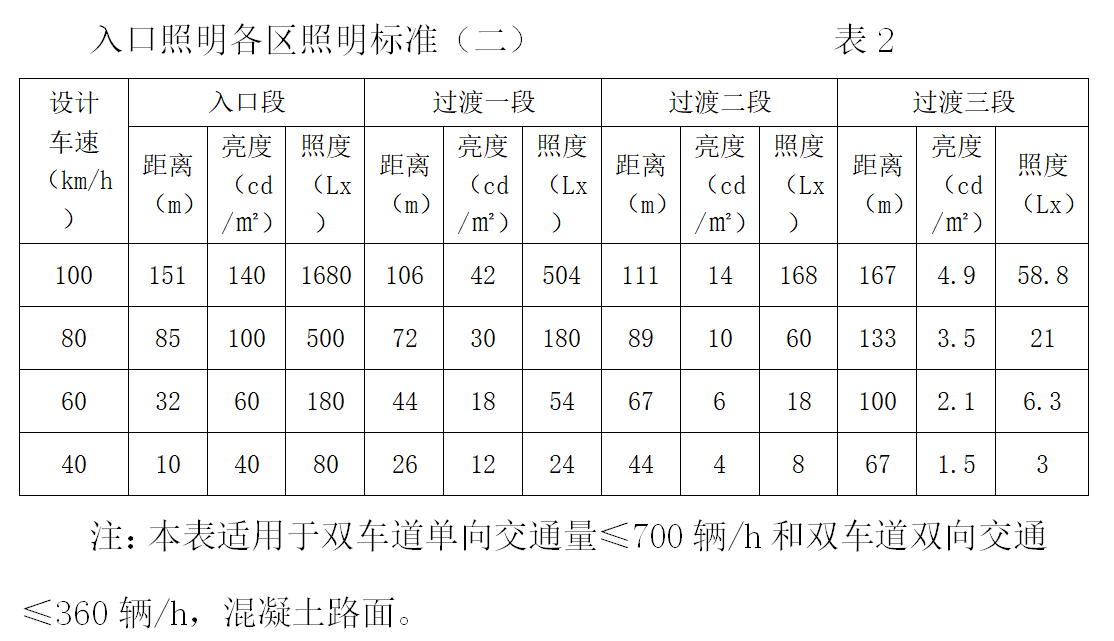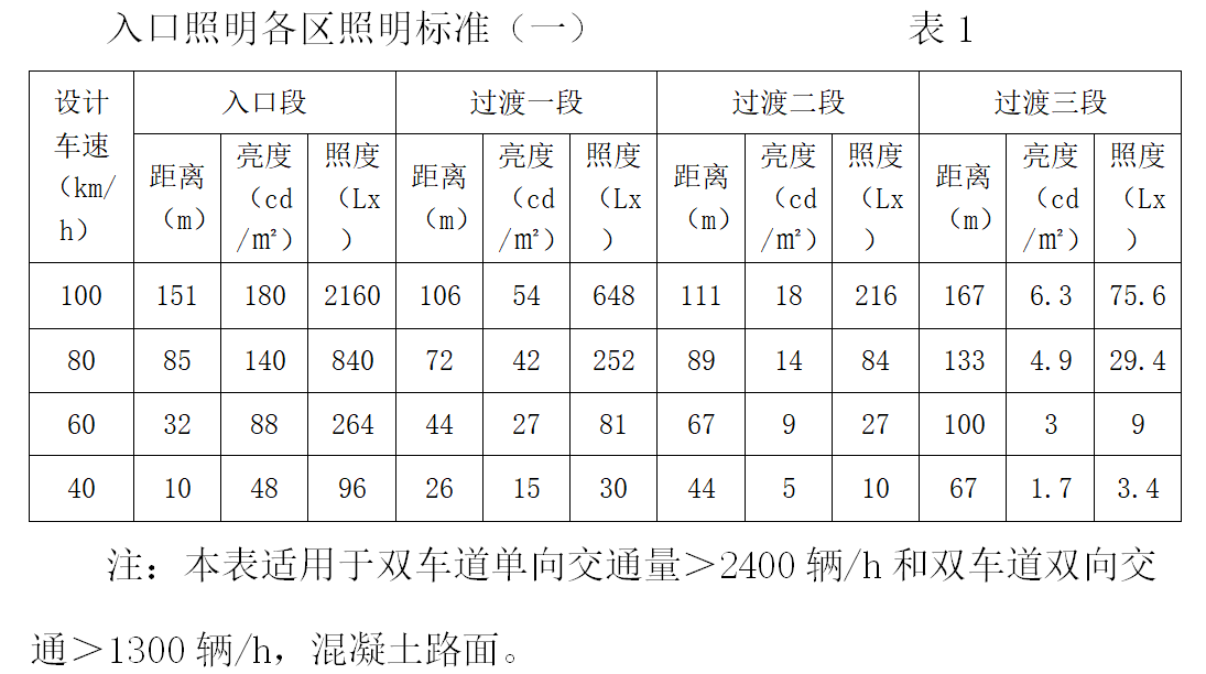 如果是大于100m的隧道,在接近隧道時可以看到隧道的出口,這樣就出現(xiàn)了黑框現(xiàn)象。為了避免這種現(xiàn)象對行車的影響,設(shè)置照明時應(yīng)采取比表1、表2更高的亮度標準。